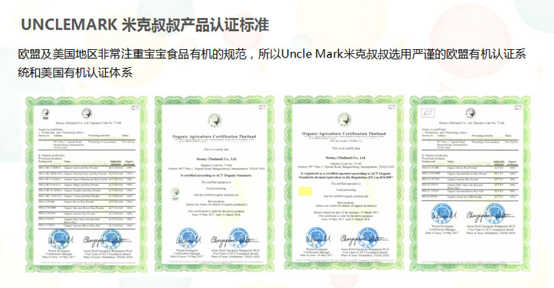 3.吃進(jìn)肚子里的必須是安全的,米克叔叔產(chǎn)品已通過歐盟有機(jī)認(rèn)證、美國有機(jī)認(rèn)證、質(zhì)量管理體系認(rèn)證、國際食品安全認(rèn)證、優(yōu)良制造標(biāo)準(zhǔn)認(rèn)證等相關(guān)國際認(rèn)證。