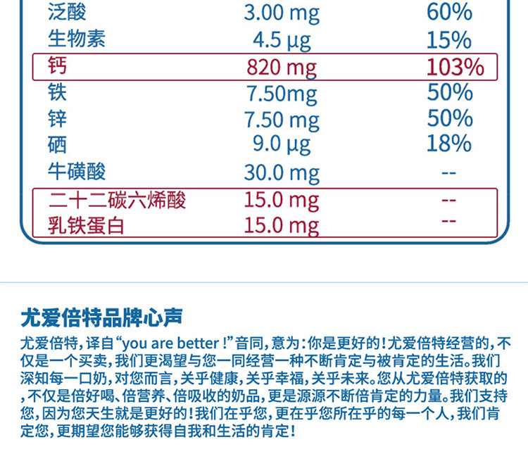 尤愛倍特,譯自“you are better!”音同,意為:你是更好的!尤愛倍特經(jīng)營的,不僅是一個(gè)買賣,我們更渴望與您一同經(jīng)營一種不斷肯定與被肯定的生活。我們深知每一口奶,對(duì)您而言,關(guān)乎健康,關(guān)乎幸福,關(guān)乎未來。您從尤愛倍特獲取的,不僅是倍好喝、倍營養(yǎng)、倍吸收的奶品,更是源源不斷倍肯定的力量。我們支持您,因?yàn)槟焐褪歉玫!我們(cè)诤跄,更在乎您所在乎的每一個(gè)人,我們肯定您,更期望您能夠獲得自我和生活的肯定!
