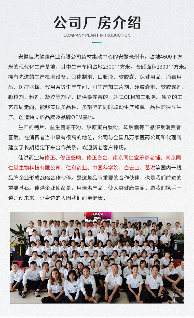 安徽佳洪健康產業(yè)有限公司位于全球最大的中藥材集散中心安徽亳州市,占地4600平方的現代化生產基地,其中生產車間占地2300平。倉儲面積2300平。國際先進的生產檢測設備,固體制劑、口服液、軟膠囊、保健用品、消毒用品、醫(yī)療器械、代用茶等生產車間,可生產加工片劑、硬膠囊劑、軟膠囊劑、顆粒劑、粉劑、凝膠等劑型,提供最完善的一站式OEM加工服務。獨立的工藝布局走向,能夠實現多品種、多劑型的同時聯動生產和單一品種的獨立生產。創(chuàng)造獨立的品牌及品牌OEM基地。