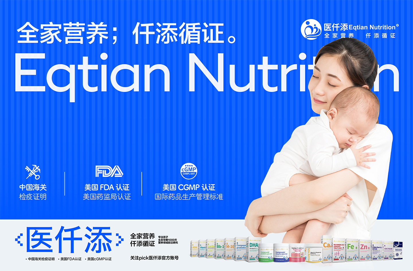 Eqtian Nutrition醫(yī)仟添系列產(chǎn)品均來自美國EQTIAN NUTRITION INC.企業(yè)生產(chǎn),堅持采用天然原材料加工 ,嚴(yán)格把關(guān)每一道生產(chǎn)過程。產(chǎn)品都通過了美國權(quán)威FDA認(rèn)證,按照美國cGMP(國際藥品生產(chǎn)管理標(biāo)準(zhǔn))條例生產(chǎn)。醫(yī)仟添自成立以來,一直致力于對營養(yǎng)學(xué)與健康食品臨床研究與開發(fā)方面的努力探索,以科學(xué)的方式為千萬家庭傳播愛與健康,這是企業(yè)品牌文化使然,健康婦幼,營養(yǎng)先行。讓醫(yī)仟添守護每一個中國家庭的營養(yǎng)健康。愛之有道,計之深遠(yuǎn)——為孩子,也為自己!