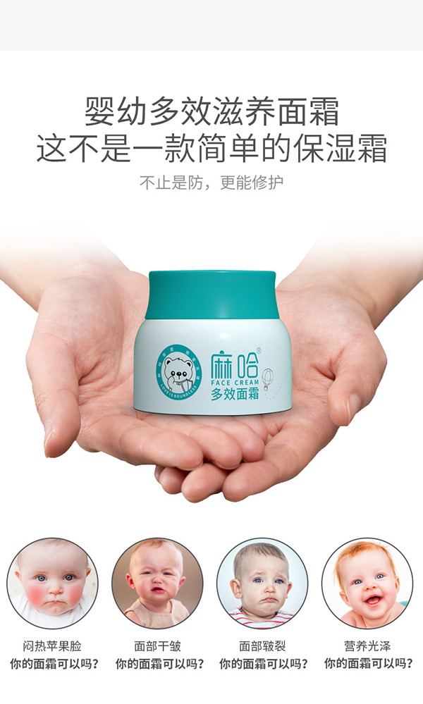 麻哈多效面霜,針對(duì)嬰幼小臉肌膚秋冬季節(jié)干燥、皴裂、粗糙以有效滋潤(rùn)保濕為前提,實(shí)現(xiàn)從內(nèi)在肌膚細(xì)胞鎖水而改變小臉問(wèn)題,秋冬必備之品,舒緩、保濕、滋潤(rùn)、防裂等,多重呵護(hù)。